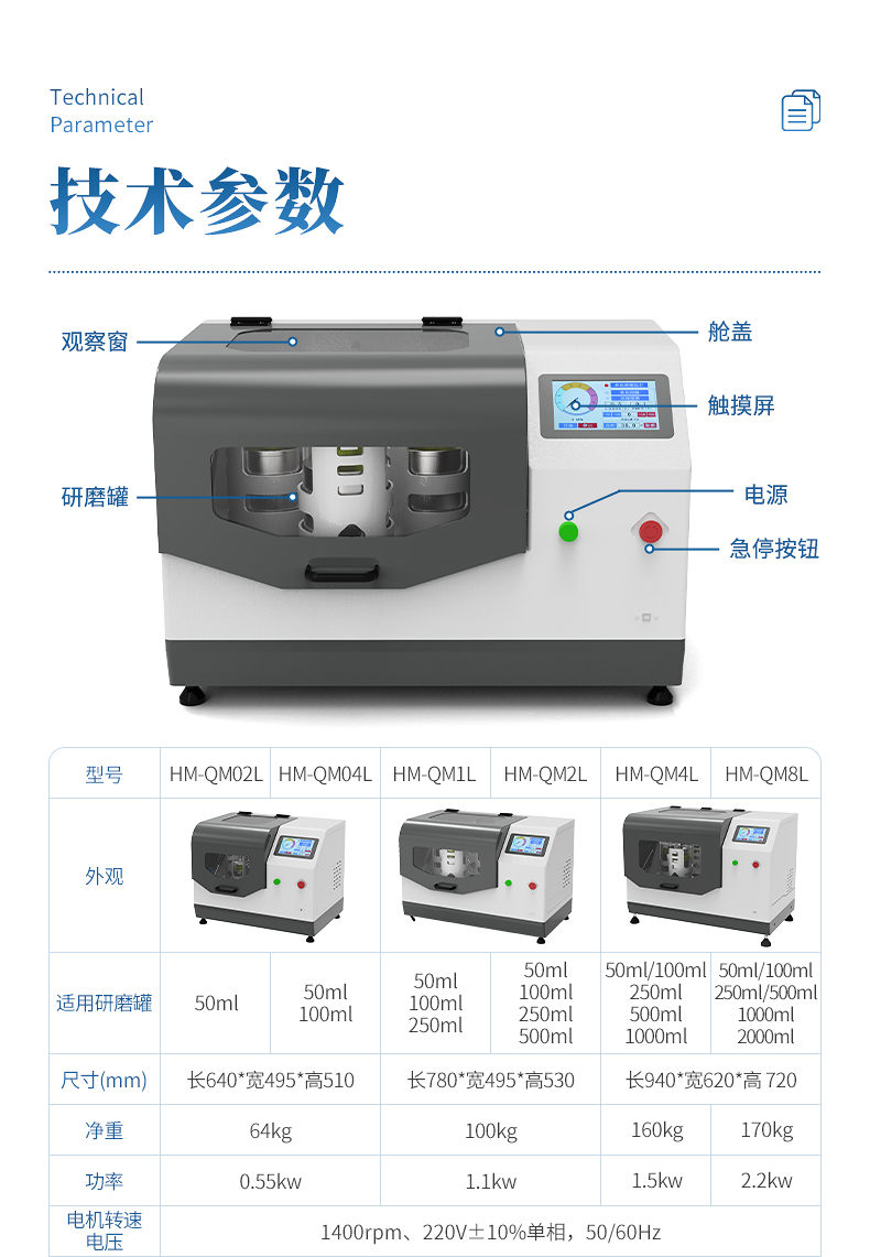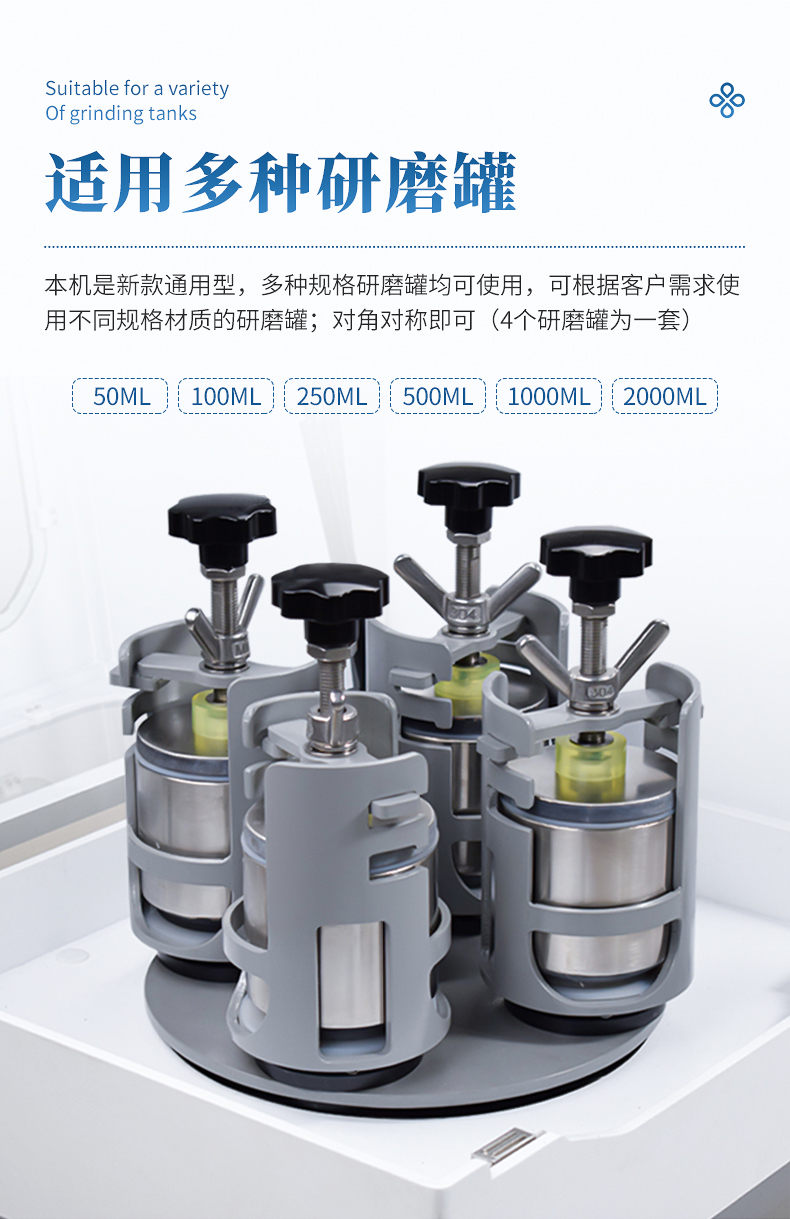 1. 適用研磨罐:本機(jī)是新款通用型,50ml規(guī)格研磨罐,可根據(jù)客戶需求使用不同材質(zhì)的研磨罐;對角對稱即可(4個研磨罐為一套)。