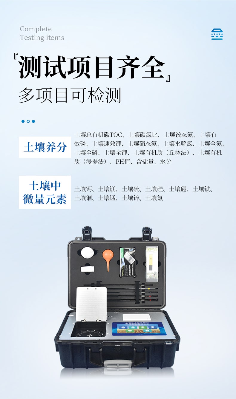 1、土壤養分:●土壤總有機碳TOC、土壤碳氮比、土壤銨態氮、土壤有效磷、土壤速效鉀、土壤硝態氮、土壤水解氮、土壤全氮、土壤全磷、土壤全鉀、土壤有機質(丘林法)、土壤有機質(浸提法)、PH值、含鹽量、水分。●土壤中微量元素:土壤鈣、土壤鎂、土壤硫、土壤硅、土壤硼、土壤鐵、土壤銅、土壤錳、土壤鋅、土壤氯。
